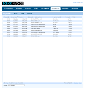 This section shows a table containing all payments. You can search, sort, filter, add, edit and delete payments. Payments can also be added from within the "Invoices" section and the "Customers" section. Payments with a negative amount are refunds.