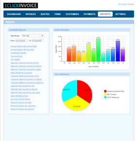This section offers you many reports to help run your business. Just select the date range and click on desired report (Invoice Report, Tax Summary, Tax Details, Sales by Customer, Customer Balances, Sales by Item etc.)