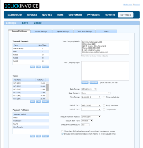 Easily manage terms, taxes and payment methods, change your company address, upload your logo, set up your base currency, date format, price format, default terms, taxes and payment method etc.