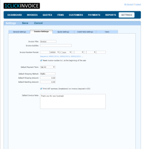 Set up the invoice title, subtitle, numbering system, default terms, shipping method, shipping amount, invoice note etc. If you are located in EU, don't forget to check "Print VAT summary on invoice".
