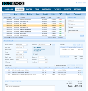 You can search, sort and filter your invoices by status, date range and customer. You can edit, delete, copy, print, save invoice as PDF, send invoice by email, create a credit note against selected invoice, add a payment etc.